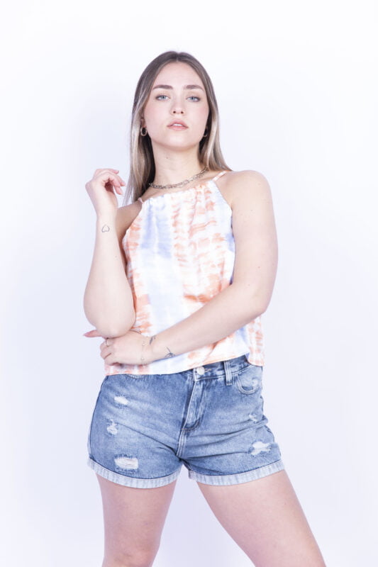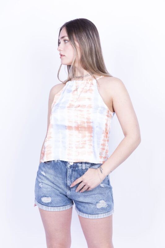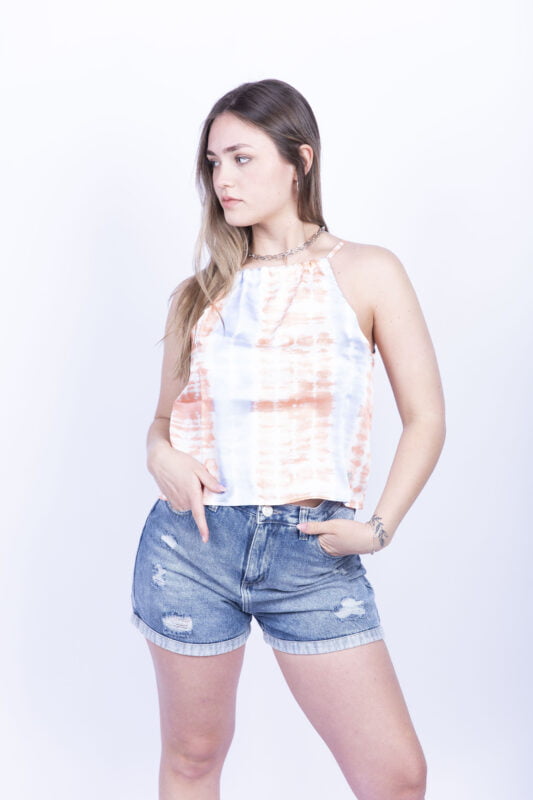 Musculosa de satén batik con bretel regulable. La modelo usa talle Small.