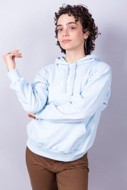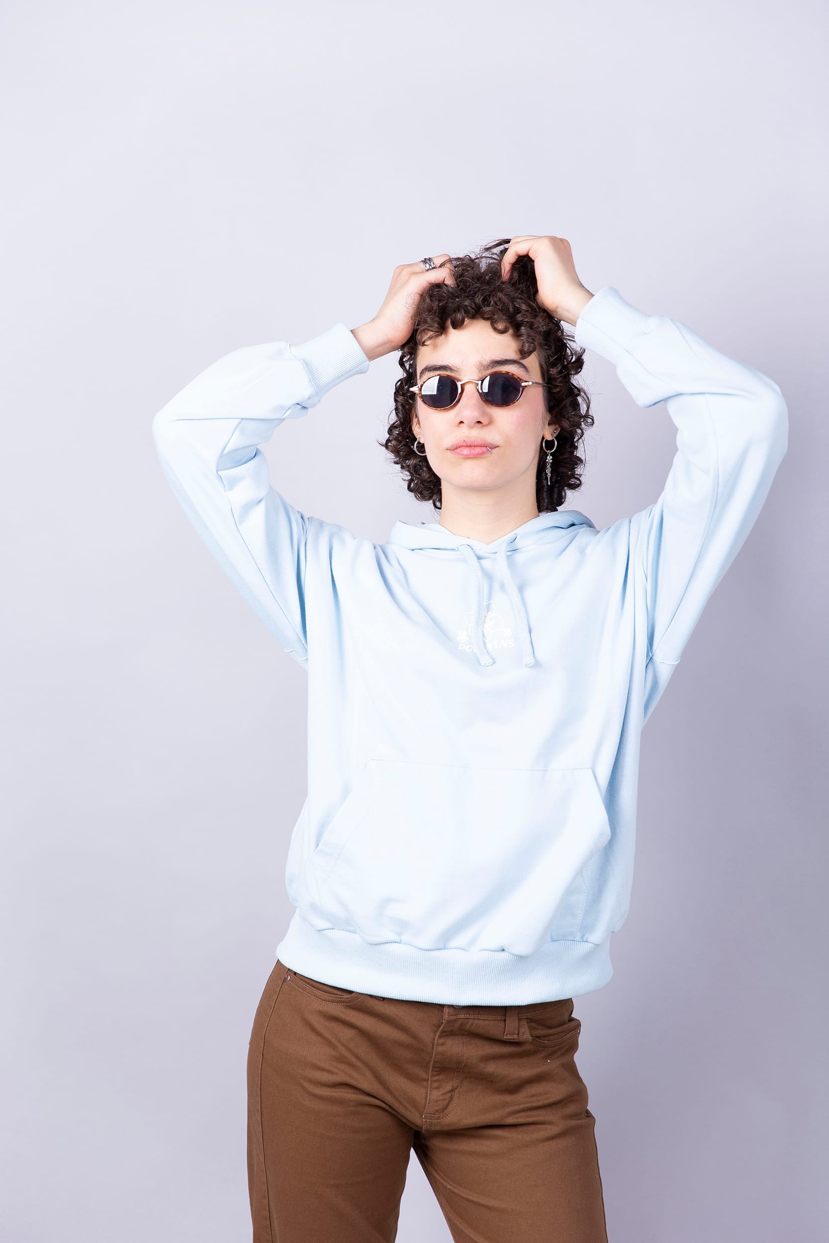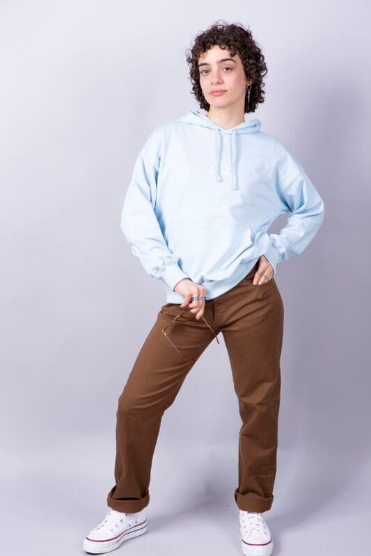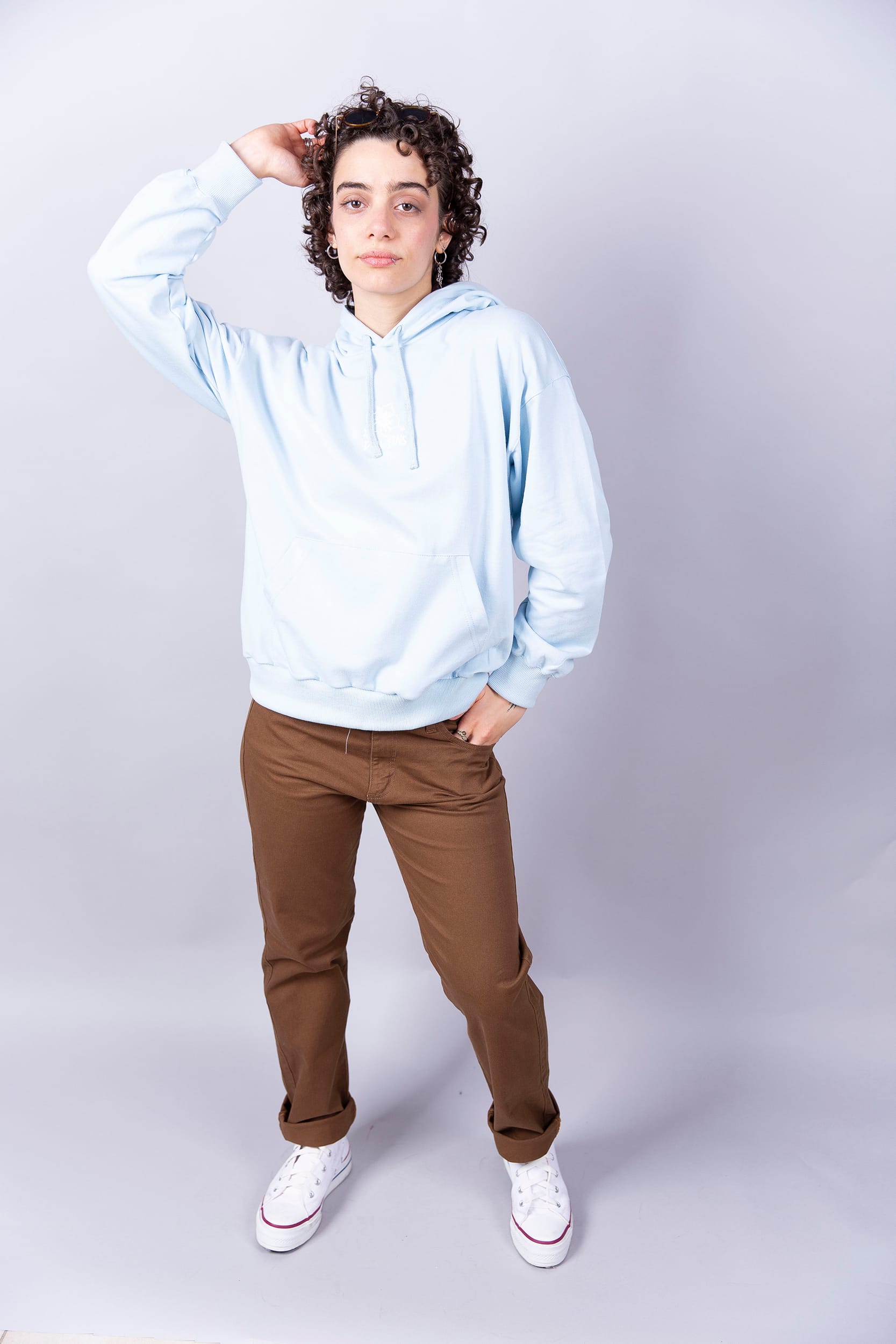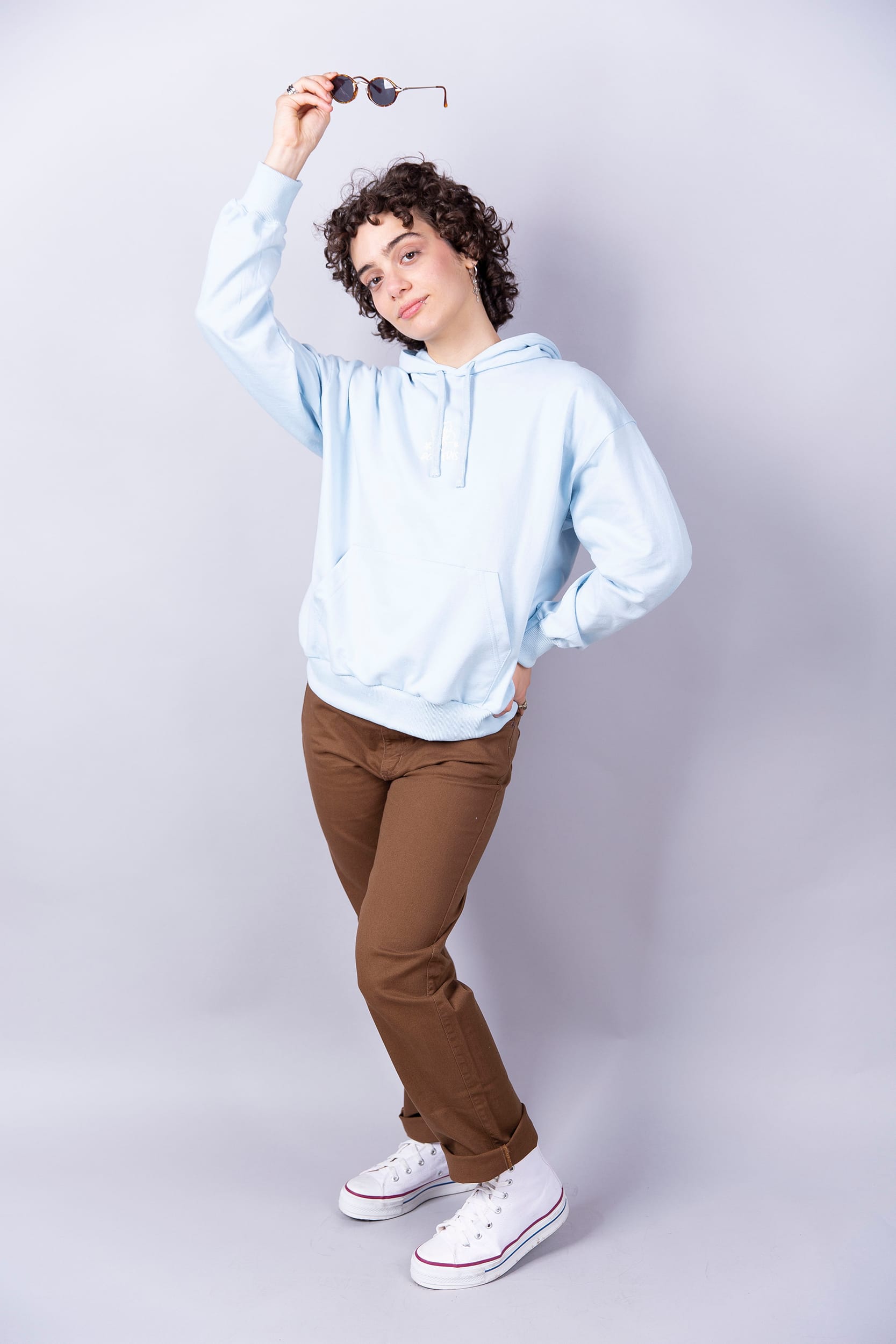 Buzo Canguro rustico corte básico, con detalle de estampa con altura, la modelo talle Small.
