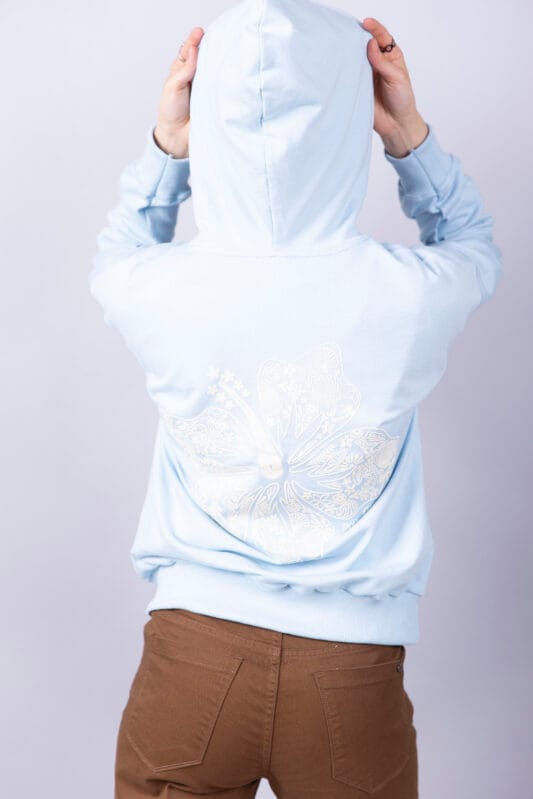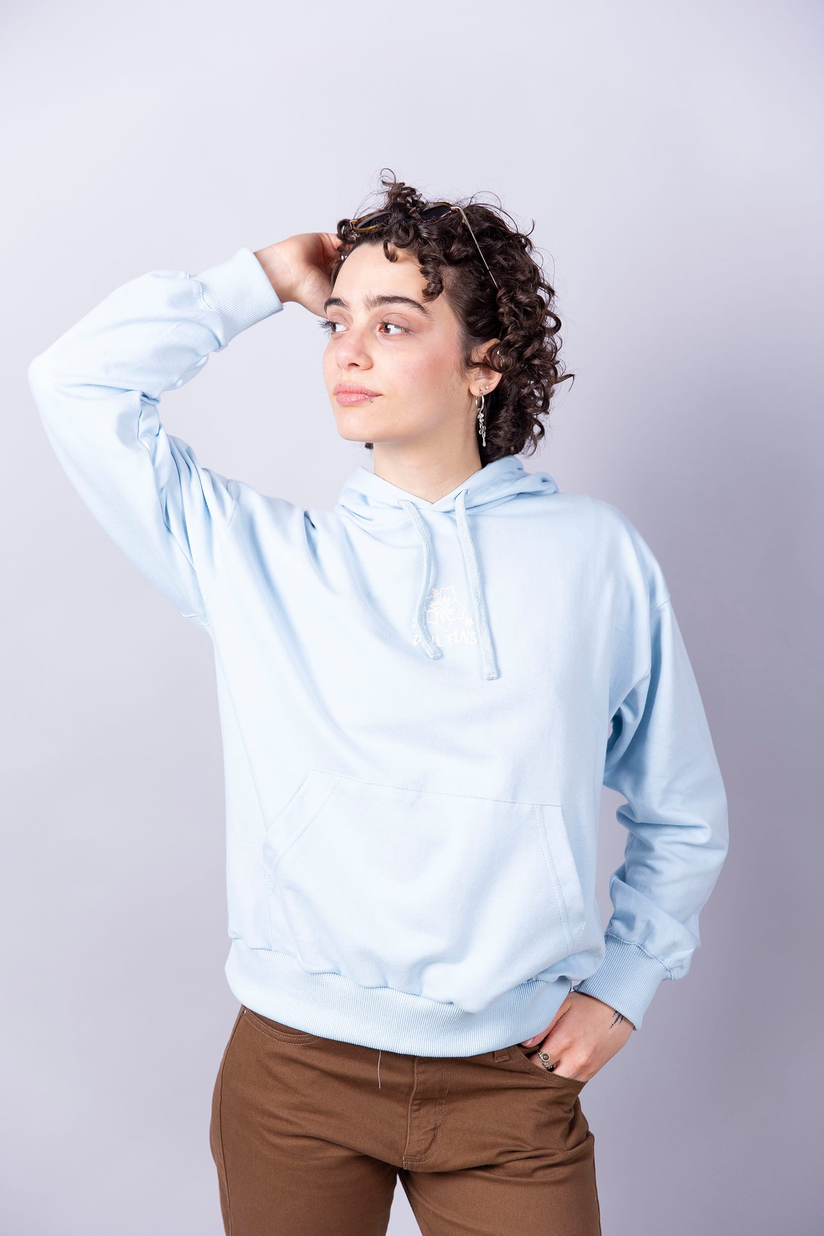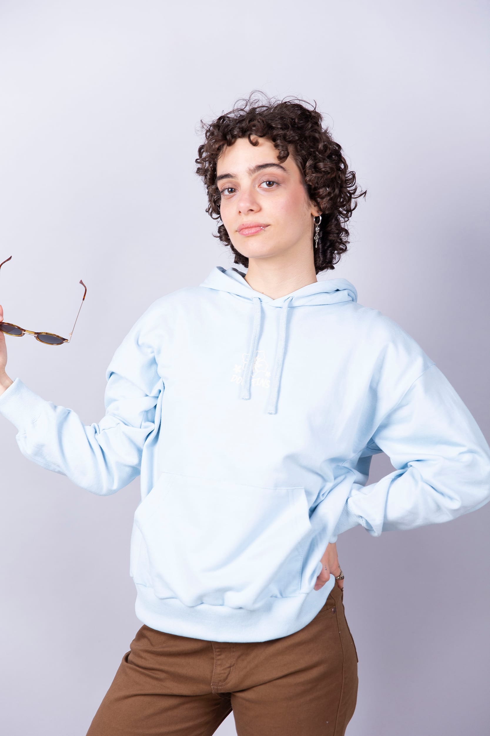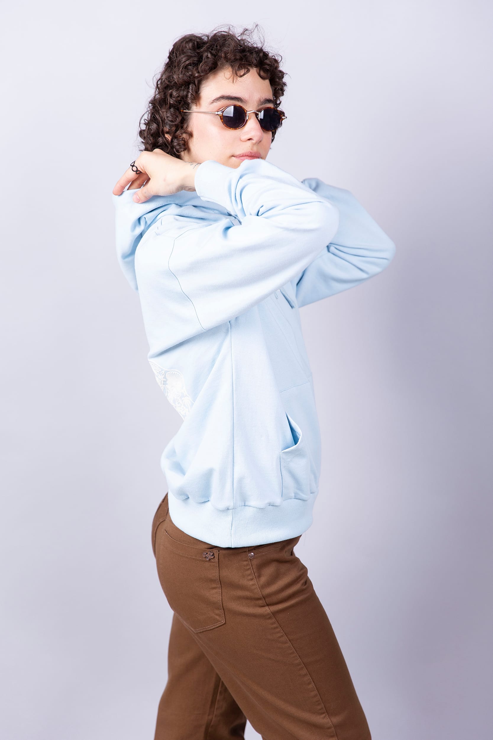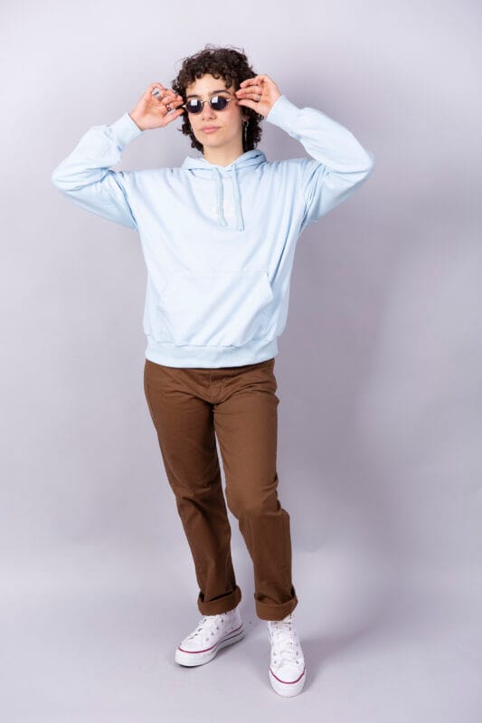 Buzo Canguro rustico corte básico, con detalle de estampa con altura, la modelo talle Small.