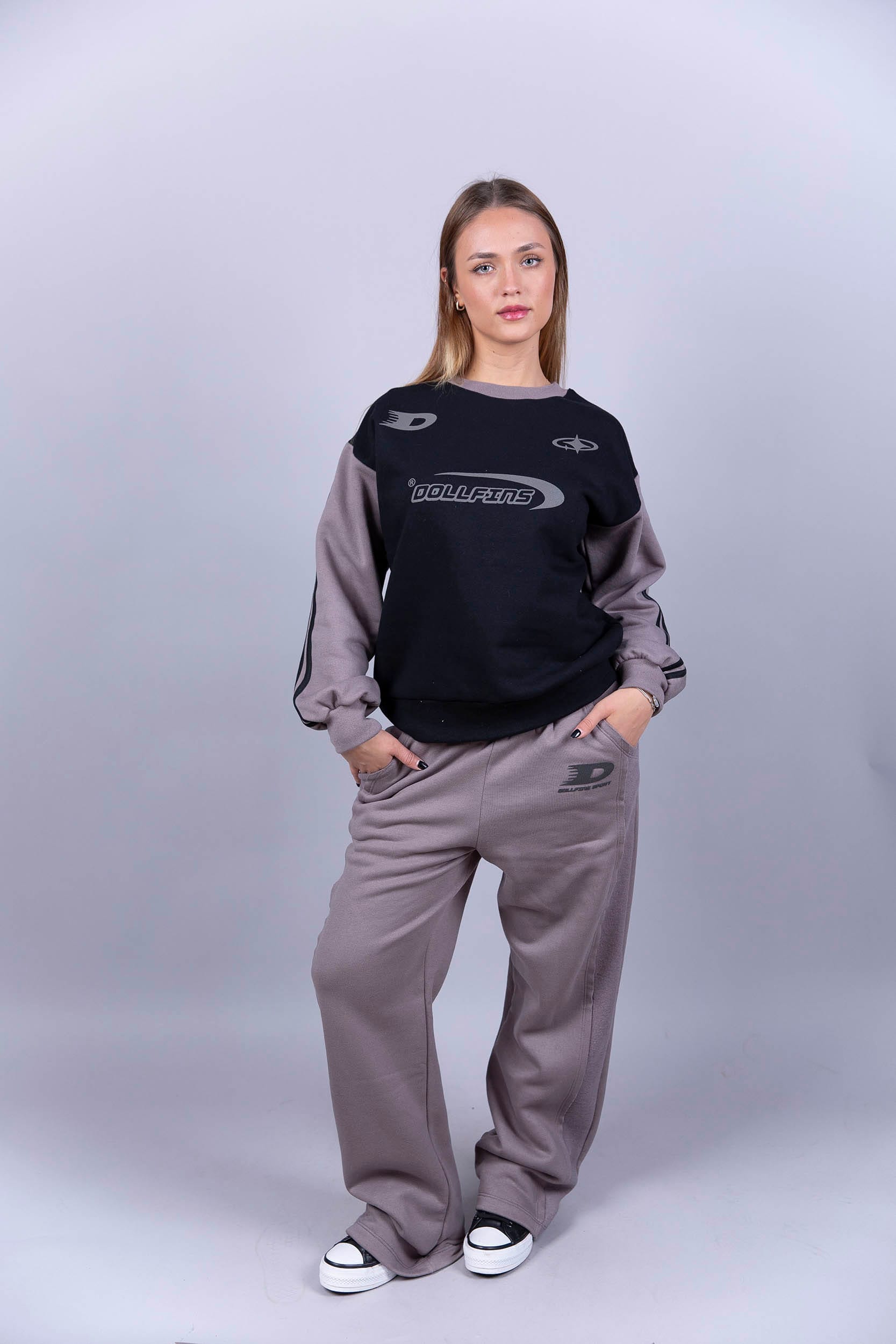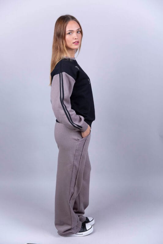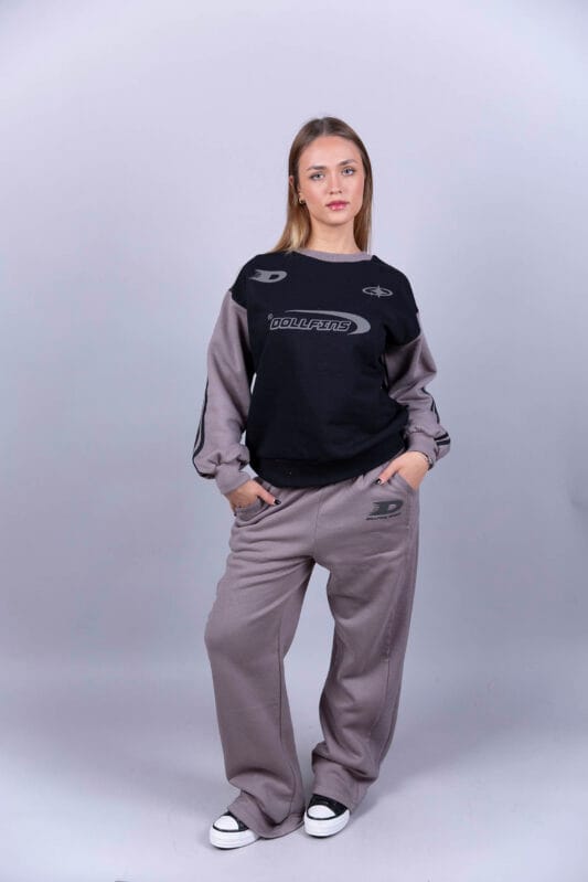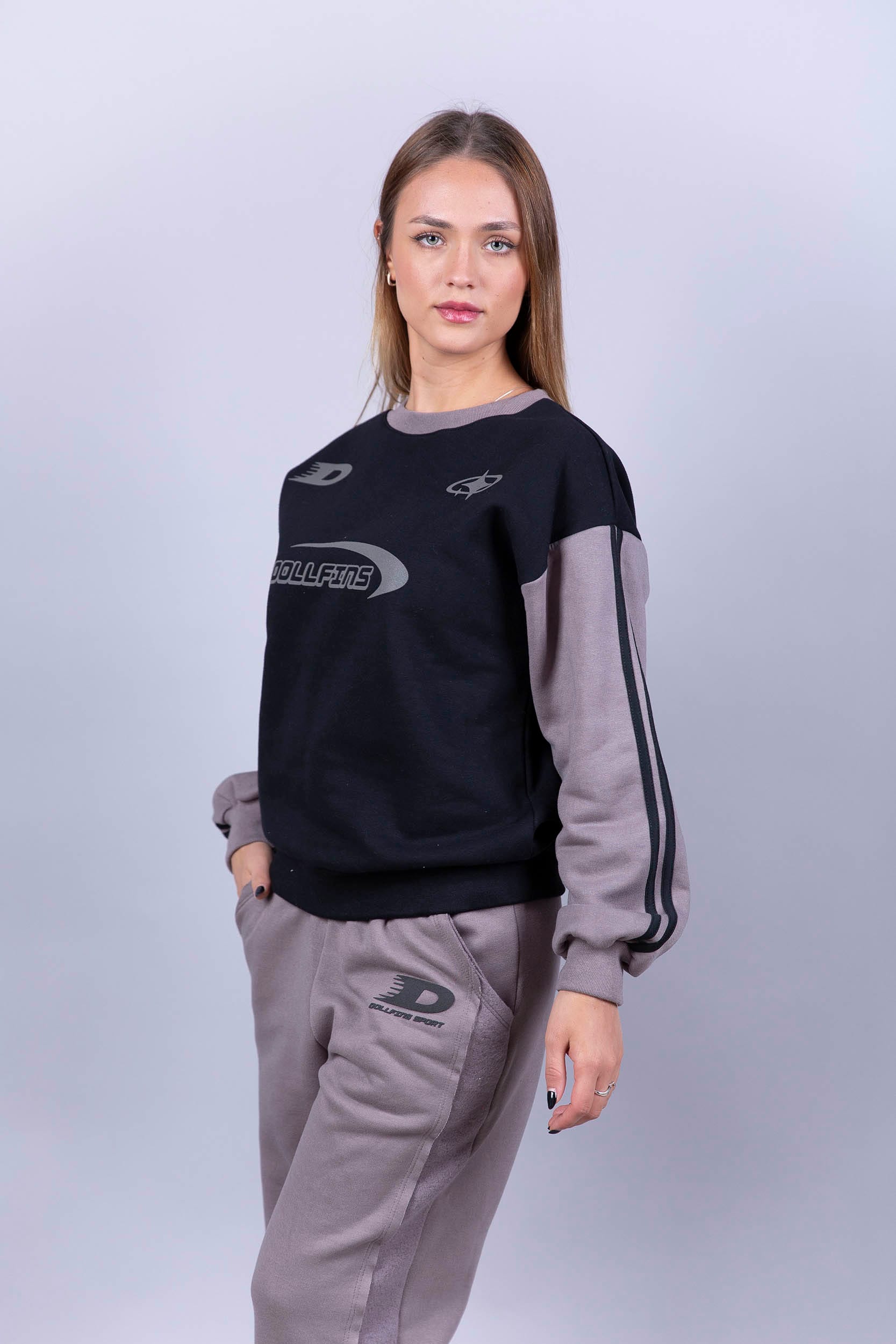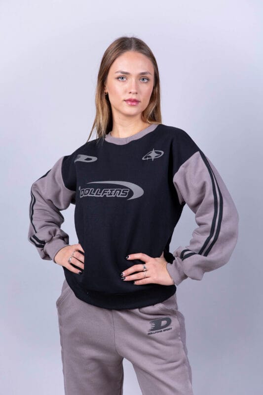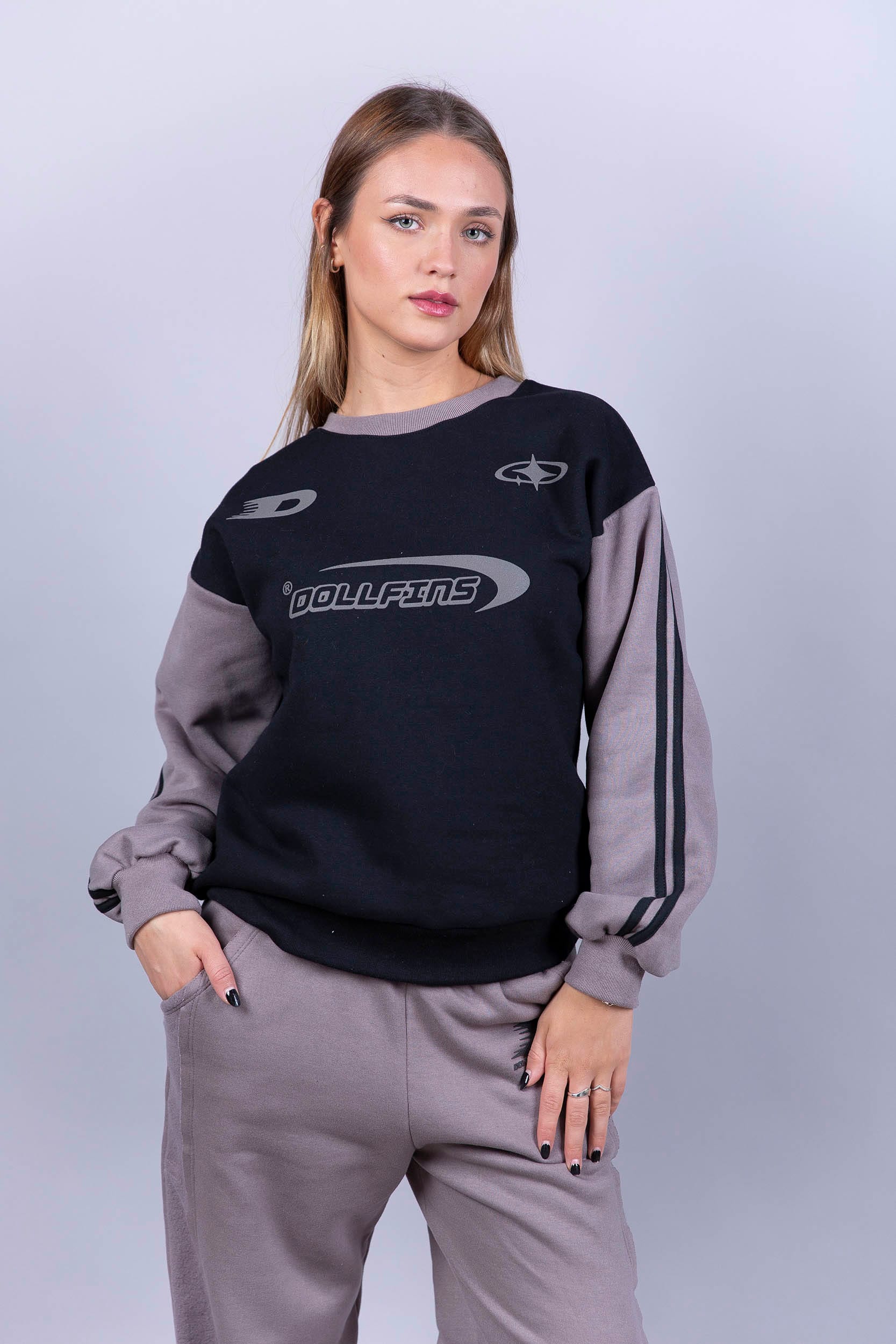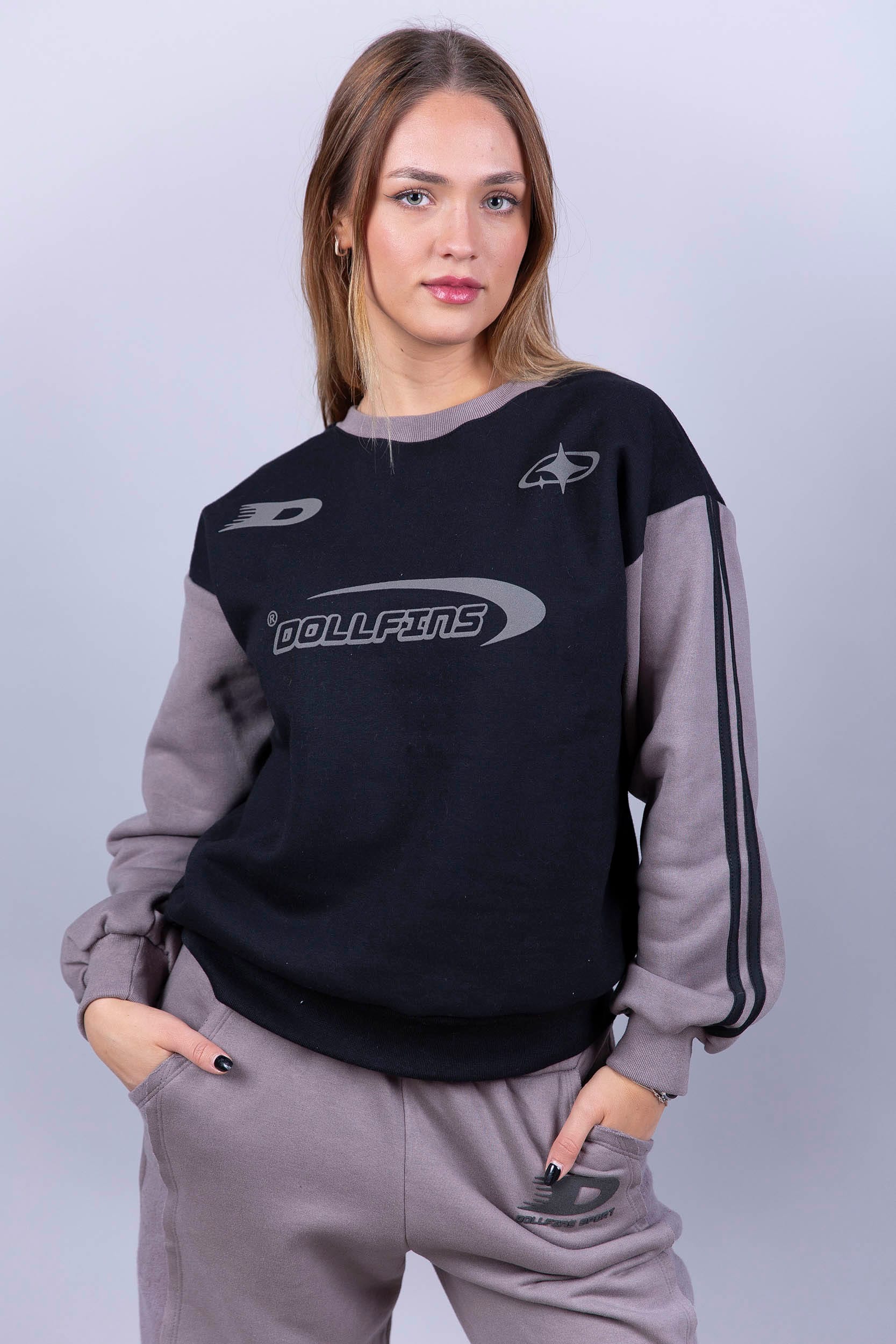 Buzo de frisa, cuello redondo, con mangas combinadas a tono con la estampa.
