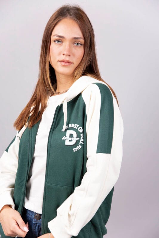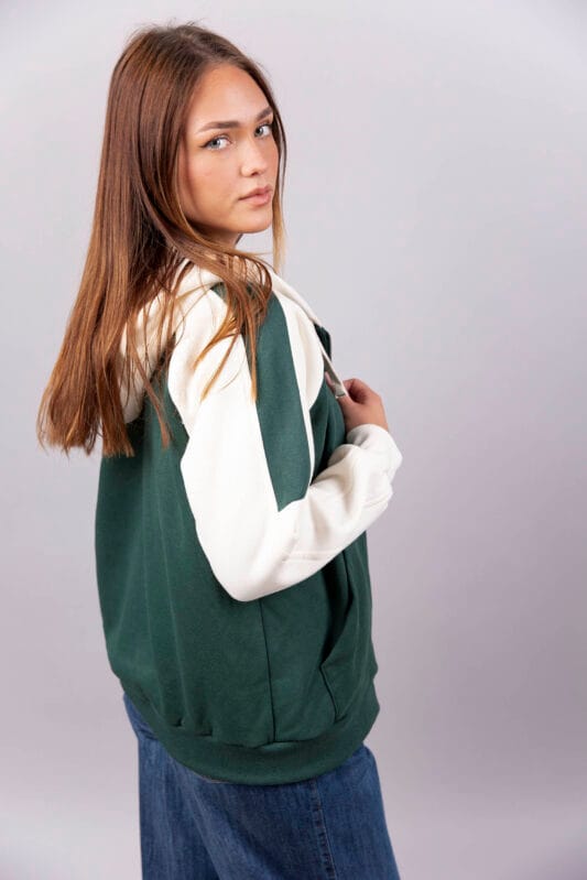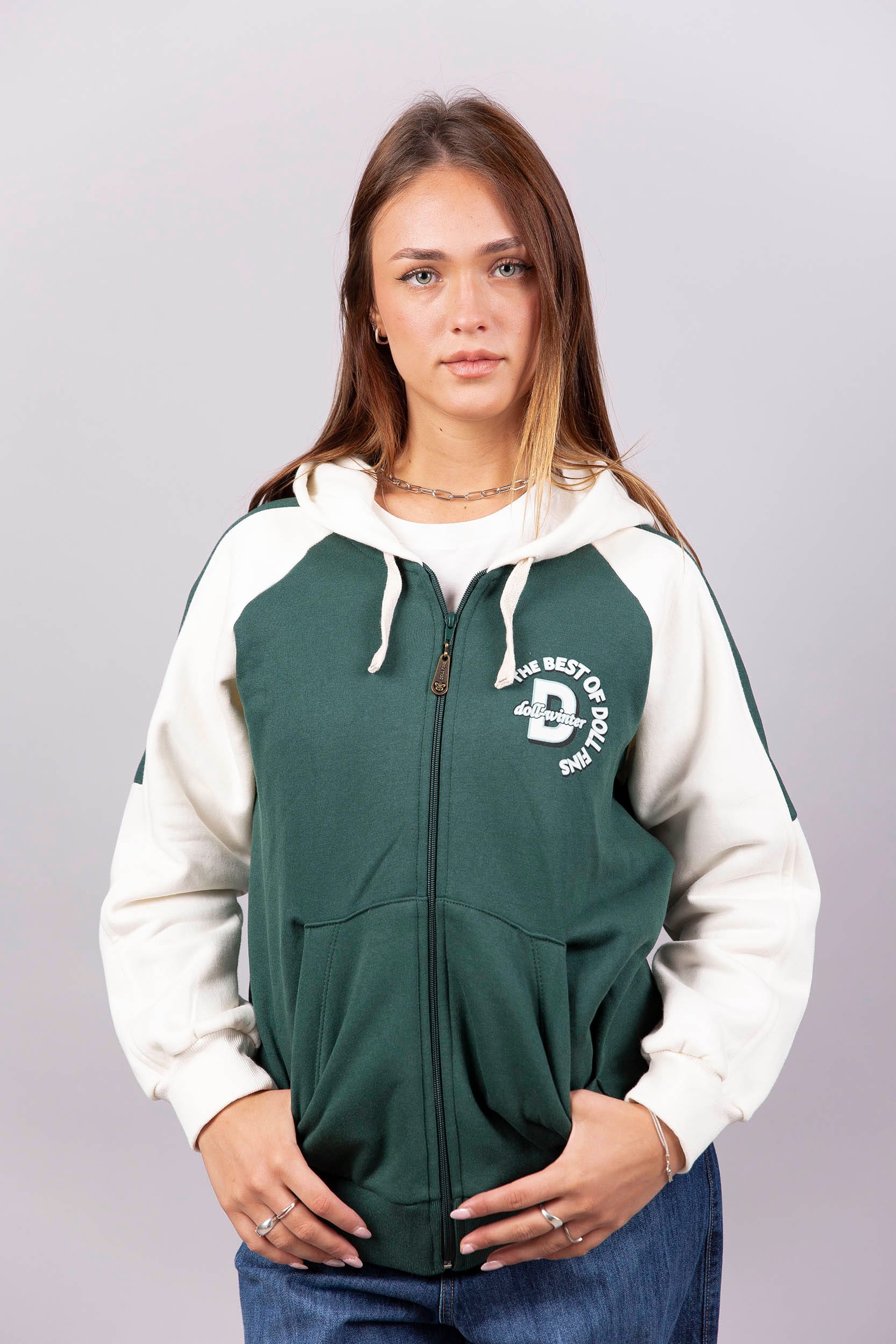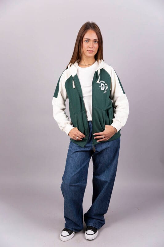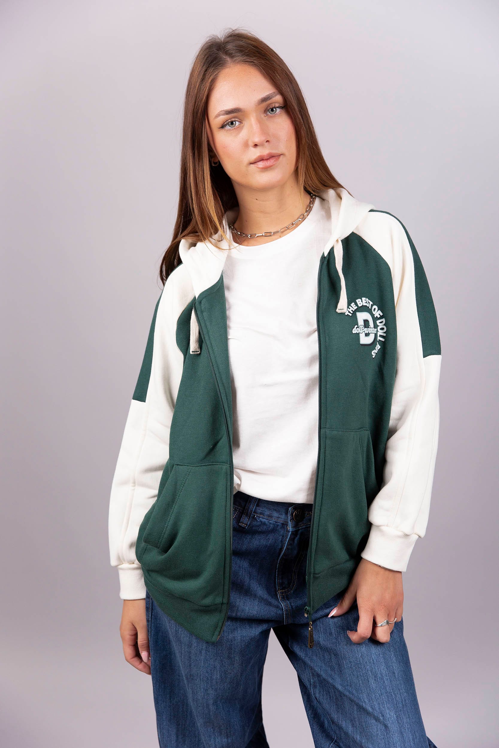 Campera canguro de frisa gruesa con estampa a tono, recorte en las mangas.