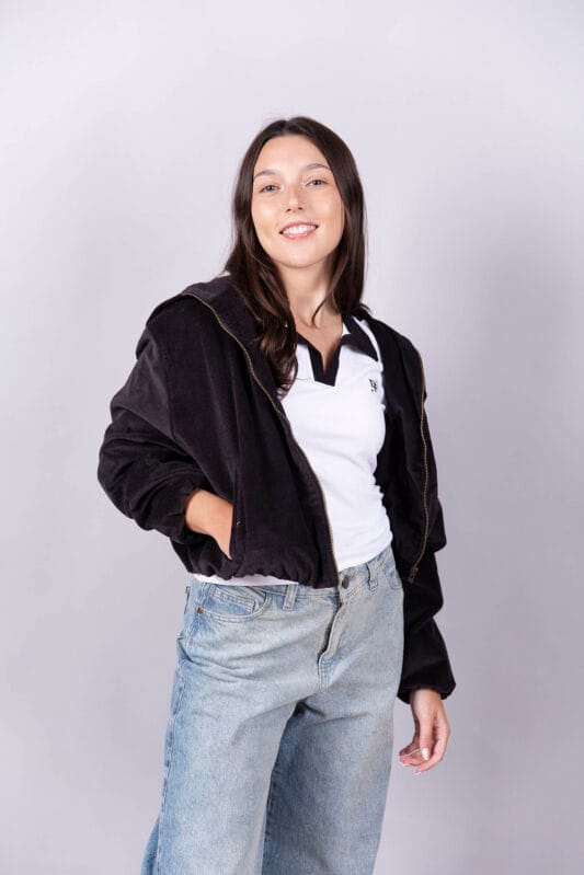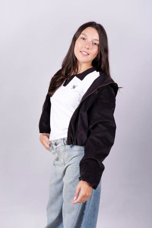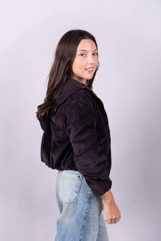Campera de corderoy, forrada con jersy y capucha, elastico embutido con cintura y puños.