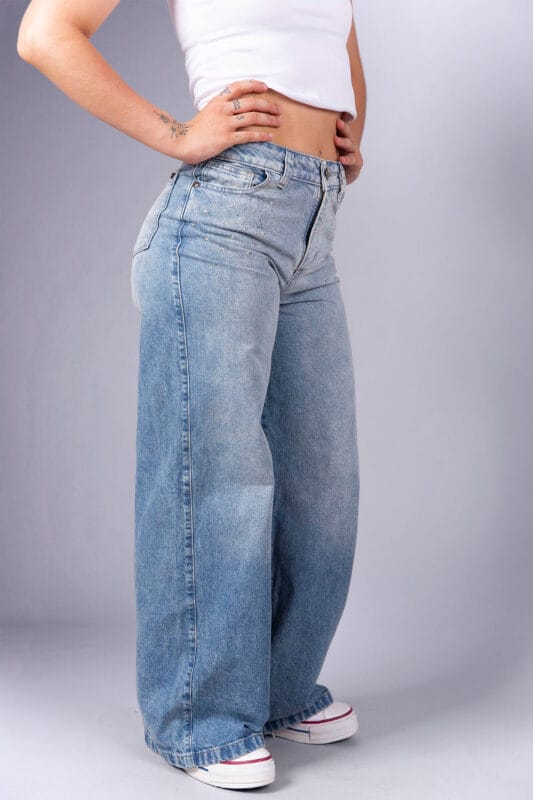 Jean wild leg, tiro medio, lavado oxido. Con aplique de tachitas en el frente.