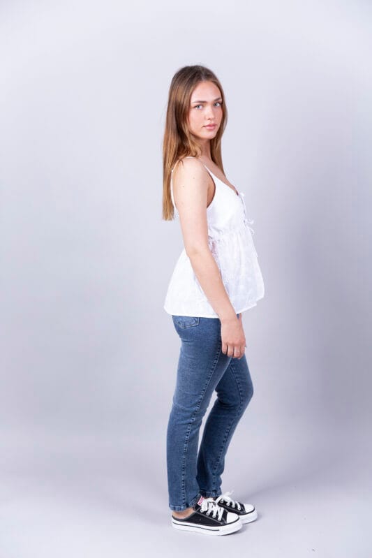 Musculosa de broderie, forrada con yersey en escote. tiras para atar en el frente y breteles regulables. Bajo busco con elastico.