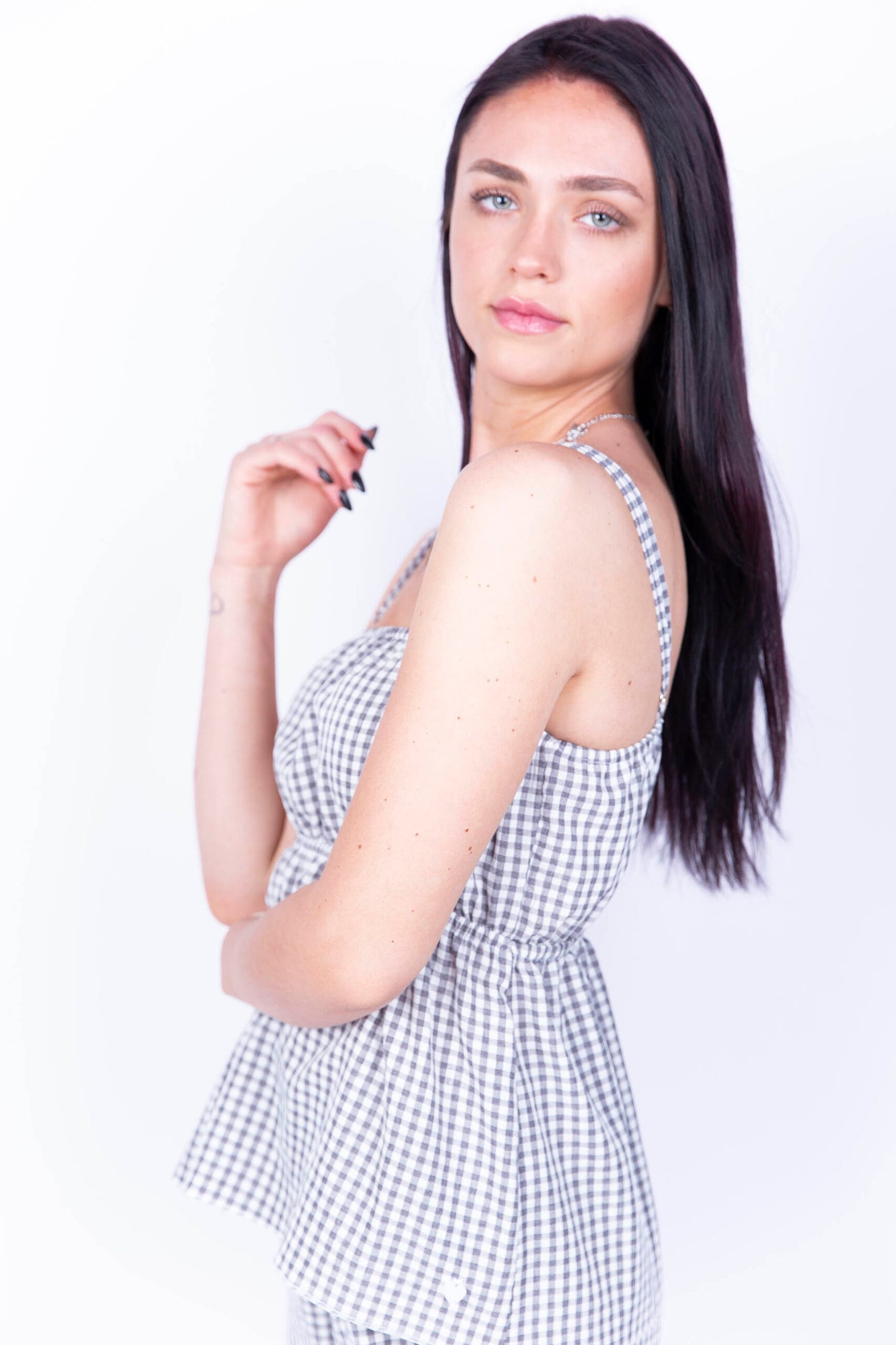 Musculosa de fibrana estampada, con elastico bajo el busto y breteles regulables. La modelo usa talle Small.