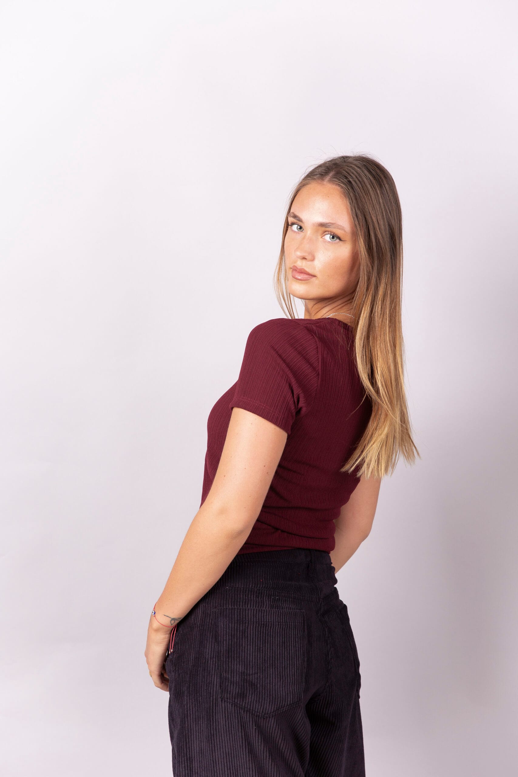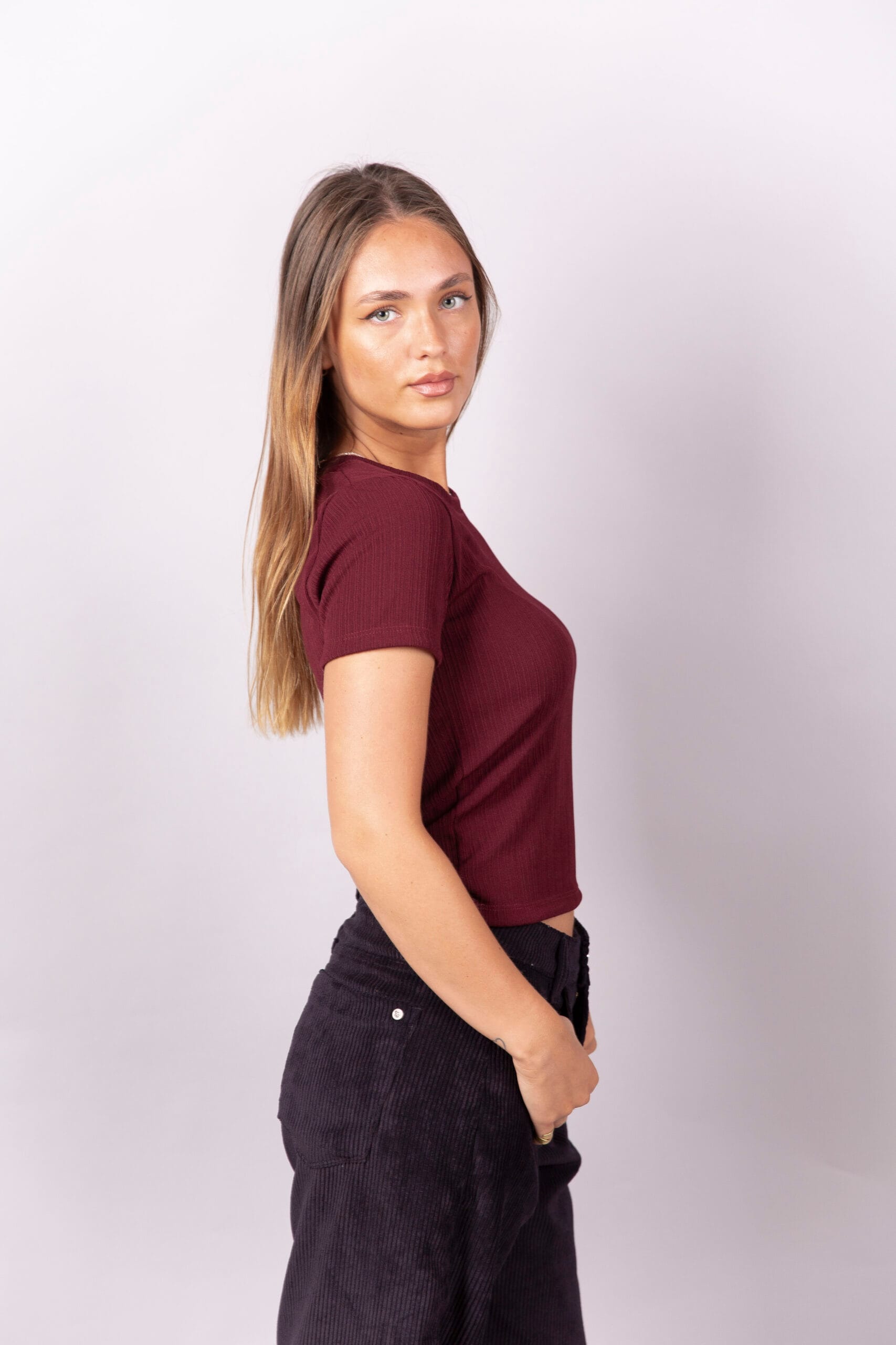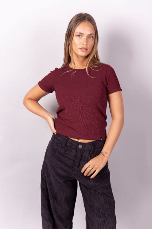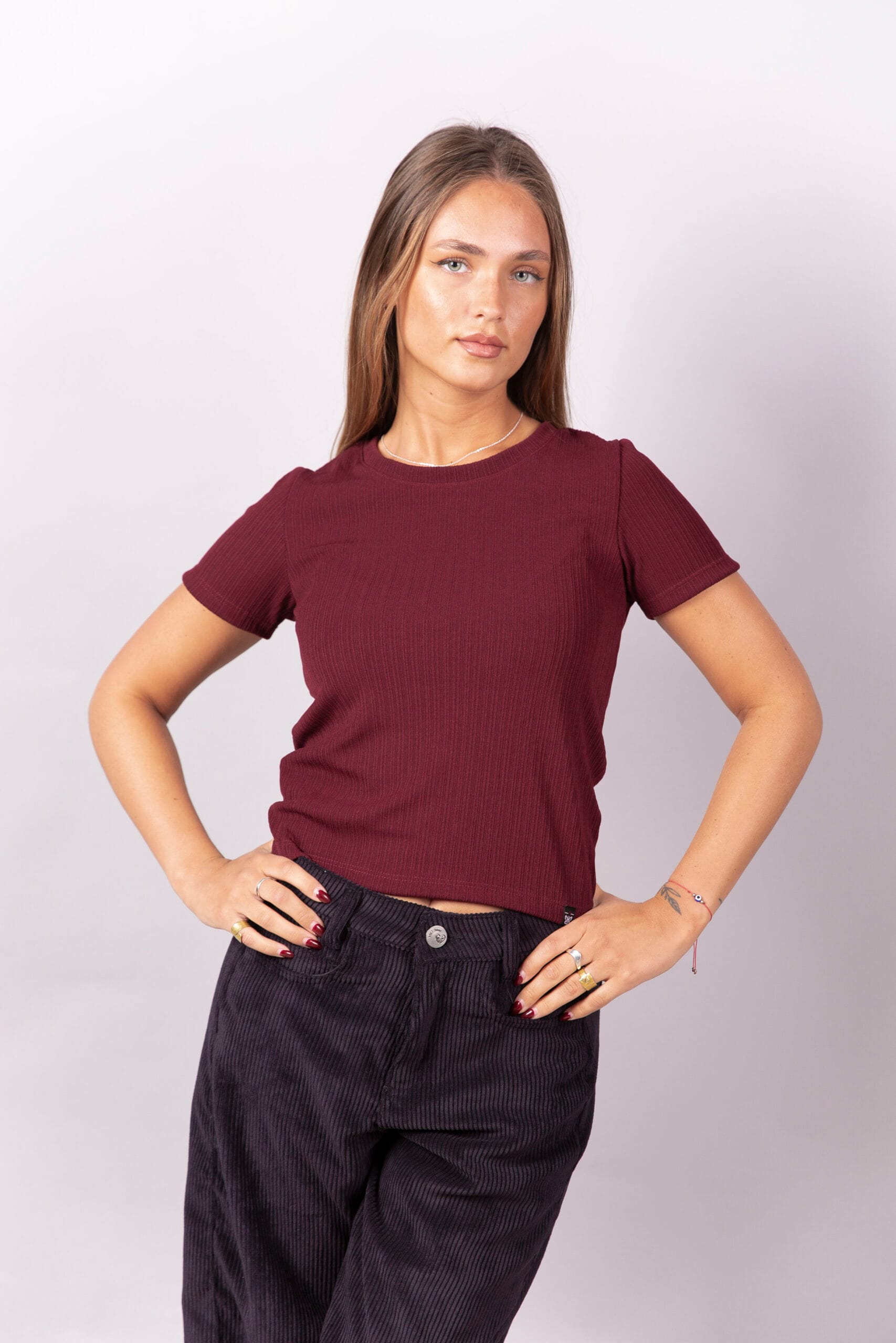Remera cuello redondo, corte basico. De morley con rayas a tono.